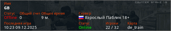 Играет на Counter Strike 1.6 сервере. Страна: РоссияПервый раз замечен 09:21 22.10.2025