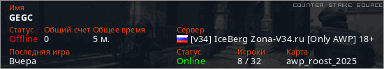 Играет на Counter Strike Source сервере. Страна: РоссияПервый раз замечен 10:50 20.01.2026