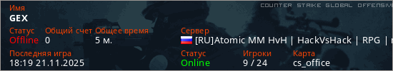 Играет на Counter Strike Global Offensive сервере. Страна: РоссияПервый раз замечен 18:17 21.11.2025
