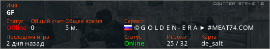 Играет на Counter Strike 1.6 сервере. Страна: РоссияПервый раз замечен 00:59 13.02.2026