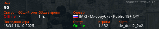 Играет на Counter Strike 1.6 сервере. Страна: РоссияПервый раз замечен 19:47 03.07.2023