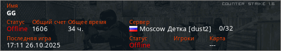 Играет на Counter Strike 1.6 сервере. Страна: РоссияПервый раз замечен 13:14 10.09.2021