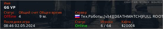 Играет на Counter Strike Source сервере. Страна: РоссияПервый раз замечен 08:11 02.05.2024