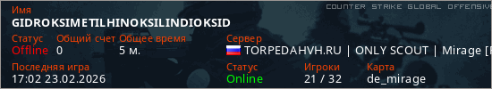 Играет на Counter Strike Global Offensive сервере. Страна: РоссияПервый раз замечен 17:00 23.02.2026