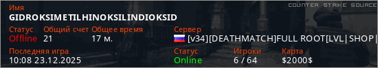 Играет на Counter Strike Source сервере. Страна: РоссияПервый раз замечен 21:44 15.12.2025