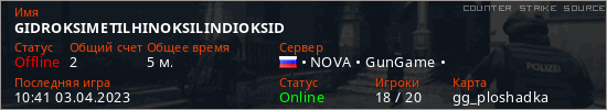 Играет на Counter Strike Source сервере. Страна: РоссияПервый раз замечен 10:37 03.04.2023