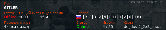 Играет на Counter Strike 1.6 сервере. Страна: РоссияПервый раз замечен 14:27 14.07.2020