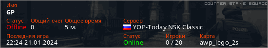 Играет на Counter Strike Source сервере. Страна: РоссияПервый раз замечен 21:34 21.01.2024