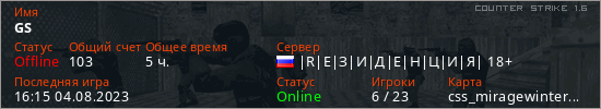 Играет на Counter Strike 1.6 сервере. Страна: РоссияПервый раз замечен 16:15 15.09.2019