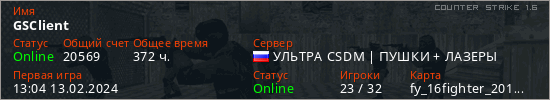 Играет на Counter Strike 1.6 сервере. Страна: РоссияПервый раз замечен 13:04 13.02.2024