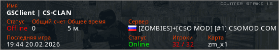 Играет на Counter Strike 1.6 сервере. Страна: РоссияПервый раз замечен 19:42 20.02.2026
