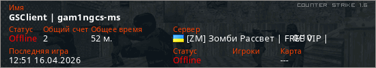 Играет на Counter Strike 1.6 сервере. Страна: УкраинаПервый раз замечен 11:52 17.03.2026