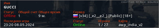 Играет на Counter Strike Source сервере. Страна: РоссияПервый раз замечен 08:53 26.03.2024