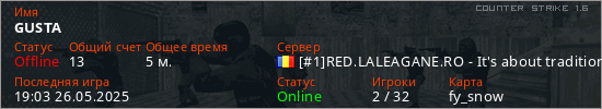 Играет на Counter Strike 1.6 сервере. Страна: РумынияПервый раз замечен 18:57 26.05.2025