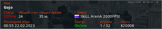 Играет на Counter Strike 1.6 сервере. Страна: РоссияПервый раз замечен 00:23 22.02.2023