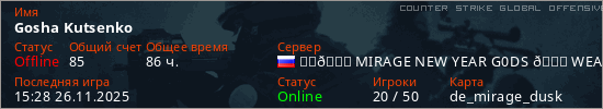Играет на Counter Strike Global Offensive сервере. Страна: РоссияПервый раз замечен 22:36 05.02.2024