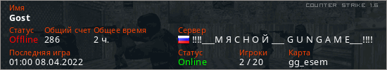 Играет на Counter Strike 1.6 сервере. Страна: РоссияПервый раз замечен 22:46 05.04.2022