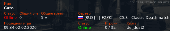 Играет на Counter Strike Source сервере. Страна: РоссияПервый раз замечен 09:07 02.02.2026