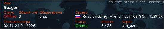 Играет на Counter Strike Global Offensive сервере. Страна: РоссияПервый раз замечен 02:28 21.01.2026