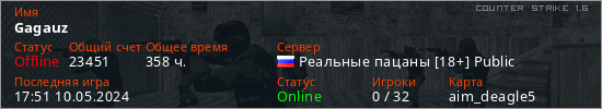 Играет на Counter Strike 1.6 сервере. Страна: РоссияПервый раз замечен 15:54 06.01.2023
