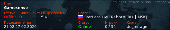 Играет на Counter Strike Global Offensive сервере. Страна: РоссияПервый раз замечен 20:59 27.02.2026