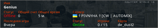 Играет на Counter Strike 1.6 сервере. Страна: УкраинаПервый раз замечен 16:28 30.03.2026