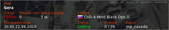 Играет на Call of Duty 4: Modern Warfare сервере. Страна: РоссияПервый раз замечен 20:38 22.06.2025