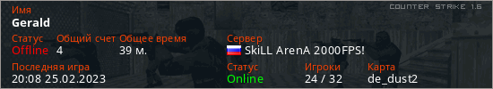Играет на Counter Strike 1.6 сервере. Страна: РоссияПервый раз замечен 19:32 25.02.2023
