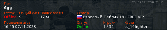 Играет на Counter Strike 1.6 сервере. Страна: РоссияПервый раз замечен 20:57 30.10.2023