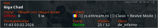 Играет на Counter Strike 1.6 сервере. Страна: РумынияПервый раз замечен 11:16 03.02.2026