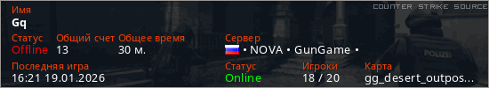 Играет на Counter Strike Source сервере. Страна: РоссияПервый раз замечен 22:20 16.01.2026