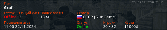 Играет на Counter Strike 1.6 сервере. Страна: РоссияПервый раз замечен 19:48 07.06.2024