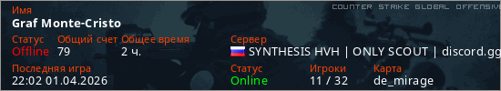 Играет на Counter Strike Global Offensive сервере. Страна: РоссияПервый раз замечен 14:35 22.03.2026