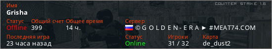 Играет на Counter Strike 1.6 сервере. Страна: РоссияПервый раз замечен 12:33 27.06.2023