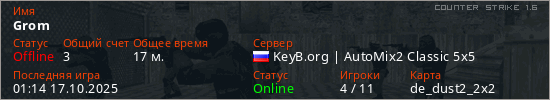 Играет на Counter Strike 1.6 сервере. Страна: РоссияПервый раз замечен 11:48 19.09.2024