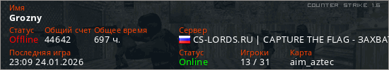 Последний раз был в сети 23:09 24.01.2026 Игрок с таким ником замечен на 16 серверах