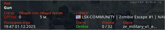 Играет на Counter Strike 1.6 сервере. Страна: СШАПервый раз замечен 19:45 01.12.2025