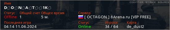 Играет на Counter Strike Source сервере. Страна: РоссияПервый раз замечен 04:12 11.06.2024