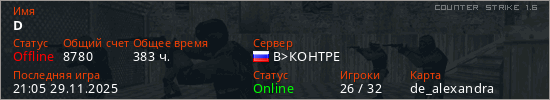 Играет на Counter Strike 1.6 сервере. Страна: РоссияПервый раз замечен 18:48 14.11.2019