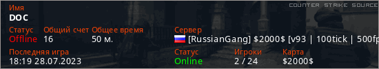 Играет на Counter Strike Source сервере. Страна: РоссияПервый раз замечен 09:43 10.06.2023