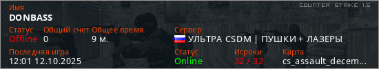 Играет на Counter Strike 1.6 сервере. Страна: РоссияПервый раз замечен 18:03 25.07.2025