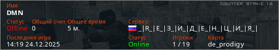 Играет на Counter Strike 1.6 сервере. Страна: РоссияПервый раз замечен 14:04 24.12.2025