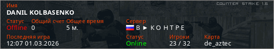 Играет на Counter Strike 1.6 сервере. Страна: РоссияПервый раз замечен 11:44 01.03.2026