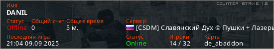 Играет на Counter Strike 1.6 сервере. Страна: РоссияПервый раз замечен 21:02 09.09.2025