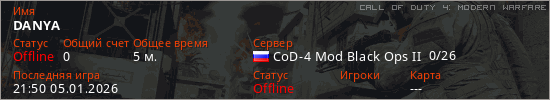 Играет на Call of Duty 4: Modern Warfare сервере. Страна: РоссияПервый раз замечен 21:46 05.01.2026