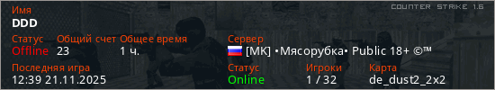 Играет на Counter Strike 1.6 сервере. Страна: РоссияПервый раз замечен 17:36 22.06.2023