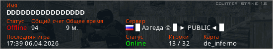 Играет на Counter Strike 1.6 сервере. Страна: РоссияПервый раз замечен 21:34 05.04.2026