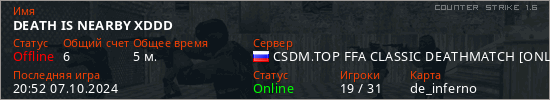 Играет на Counter Strike 1.6 сервере. Страна: РоссияПервый раз замечен 20:33 07.10.2024