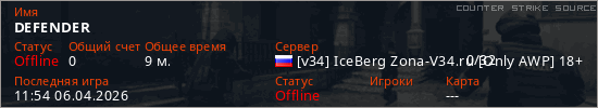 Играет на Counter Strike Source сервере. Страна: РоссияПервый раз замечен 22:28 05.04.2026