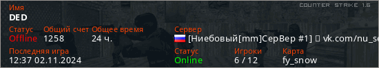 Последний раз был в сети 12:37 02.11.2024 Игрок с таким ником замечен на 42 серверах